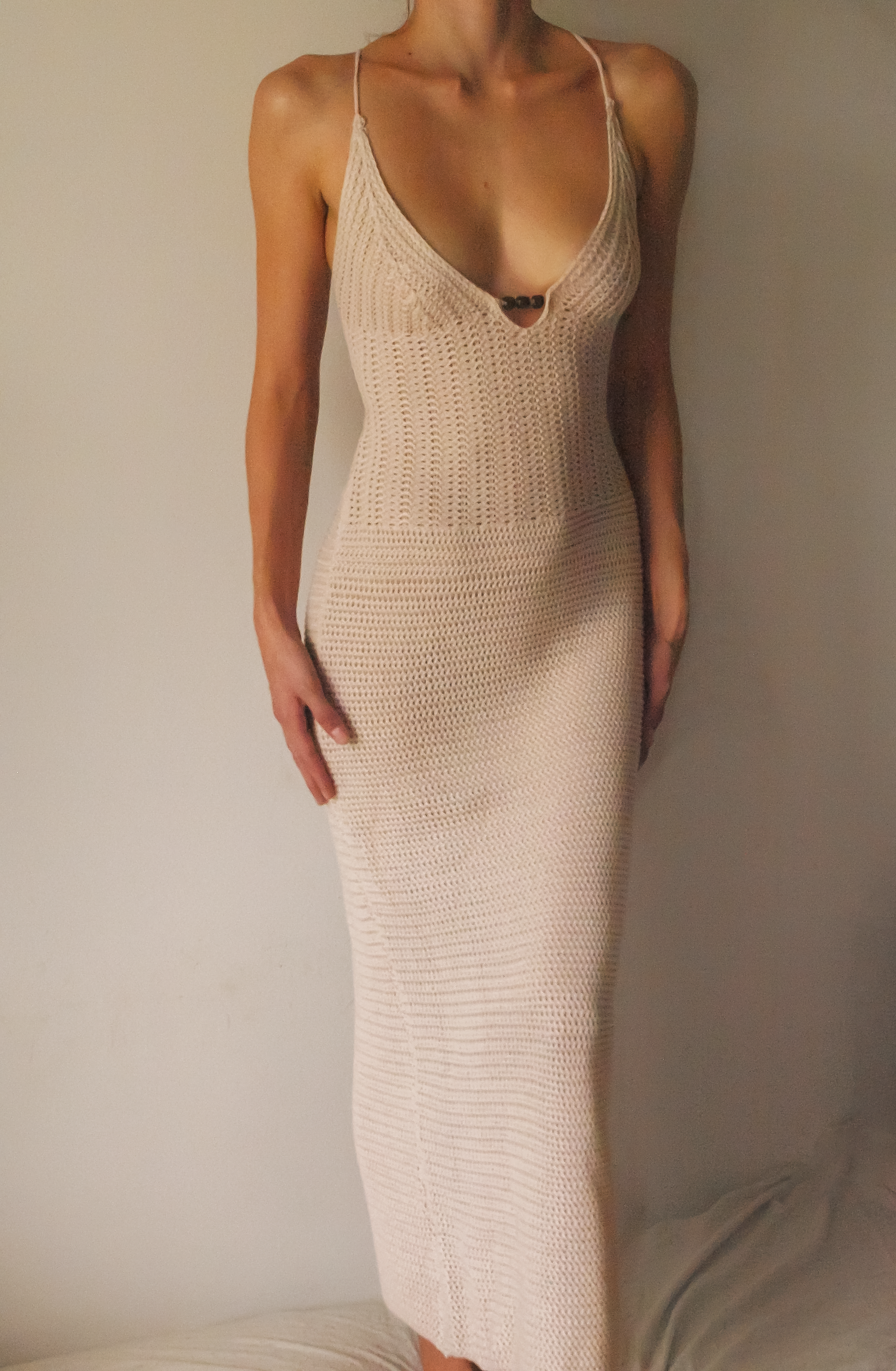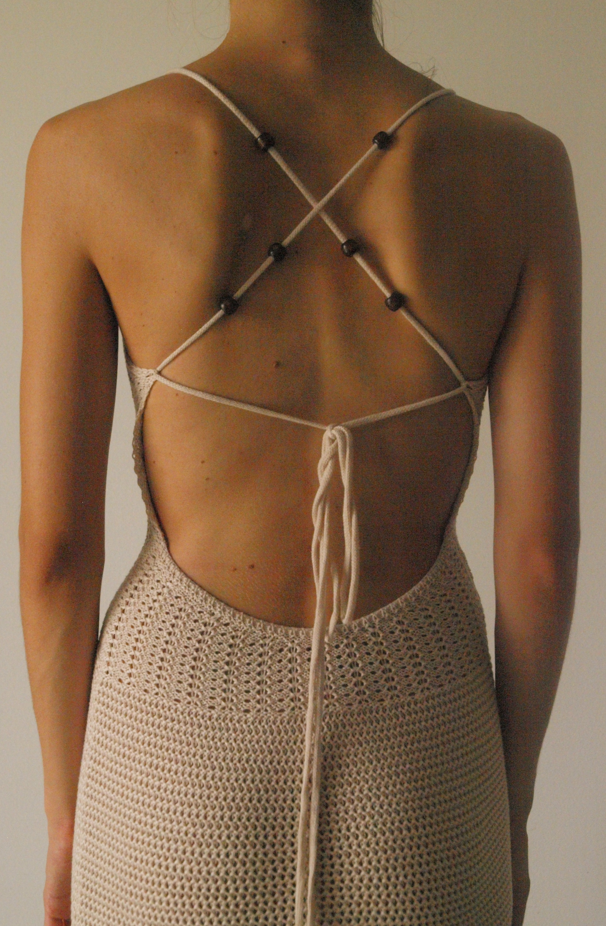 Mediteranska Nit - kukičana haljina u nježnoj bež nijansi. Uski kroj prati liniju tijela, dok tanke naramenice prelaze u križanje na leđima s detaljima od perlica, stvarajući zanimljiv vizualni naglasak. Prirodna tekstura pletiva daje ovoj haljini ležeran, ali istovremeno profinjen karakter.