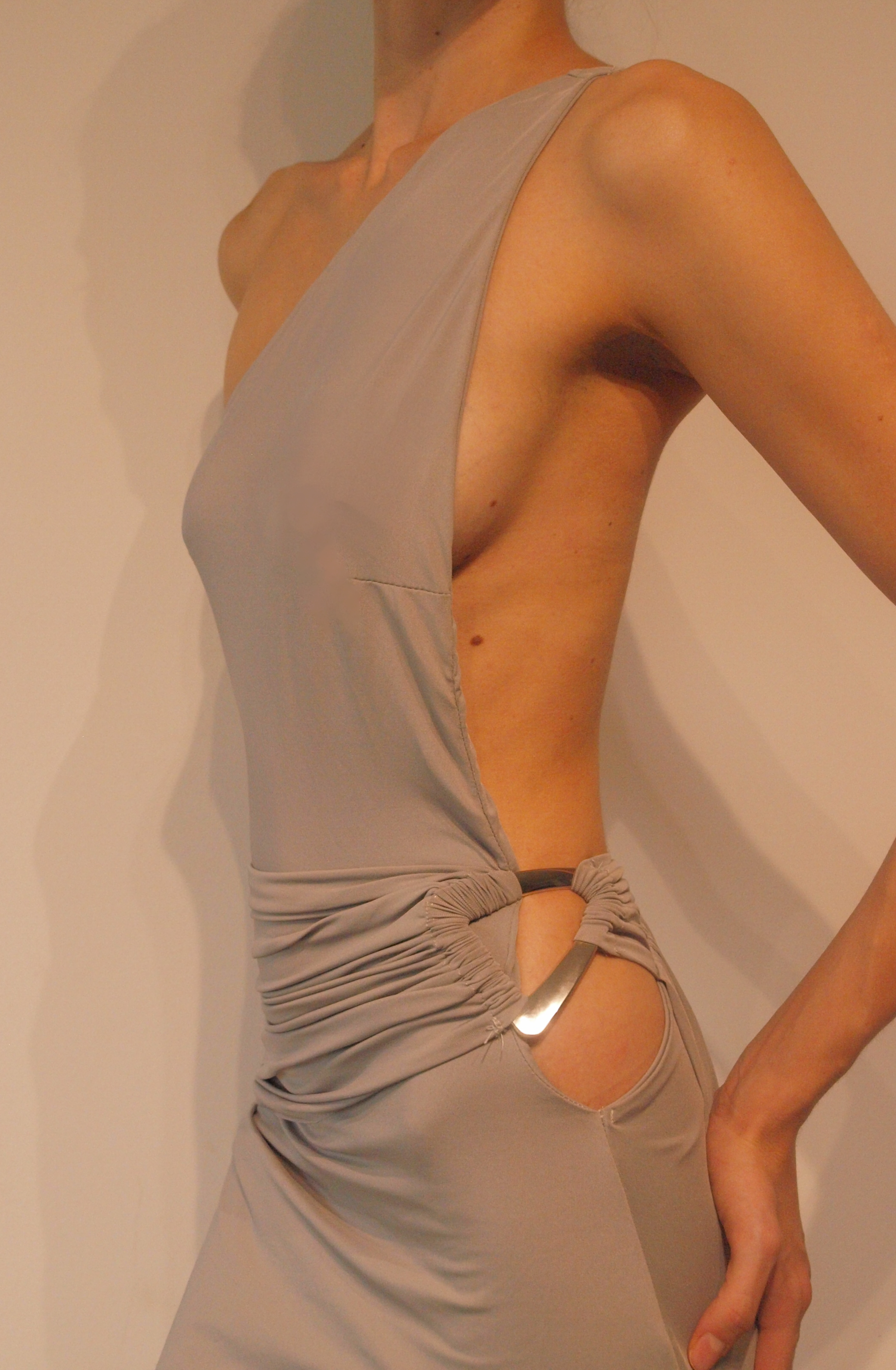 Detalj metalnog trokuta naglašava struk, dok fluidan pad tkanine omogućuje graciozno kretanje.