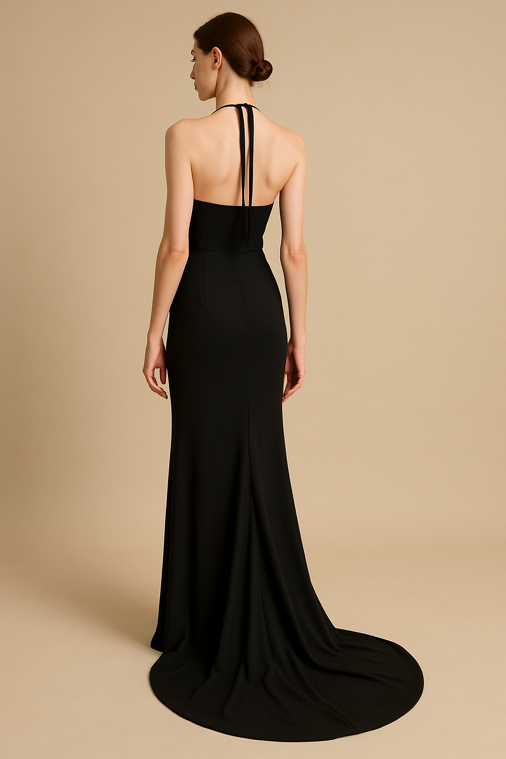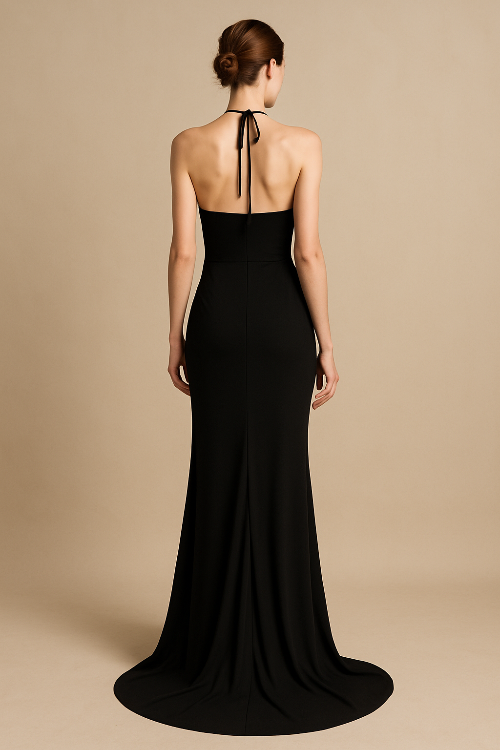 Ova zavodljiva crna haljina odiše šarmom i luksuzom. Izrađena od visokokvalitetne tkanine koja grli tijelo i laganim šlepom na dnu haljine. S dubokim dekolteom u obliku kapljice i naglašenim srebrnim cvjetovima na ovratniku, Noir Blossom Haljina savršena je za večernje izlaske ili svečane prigode.
