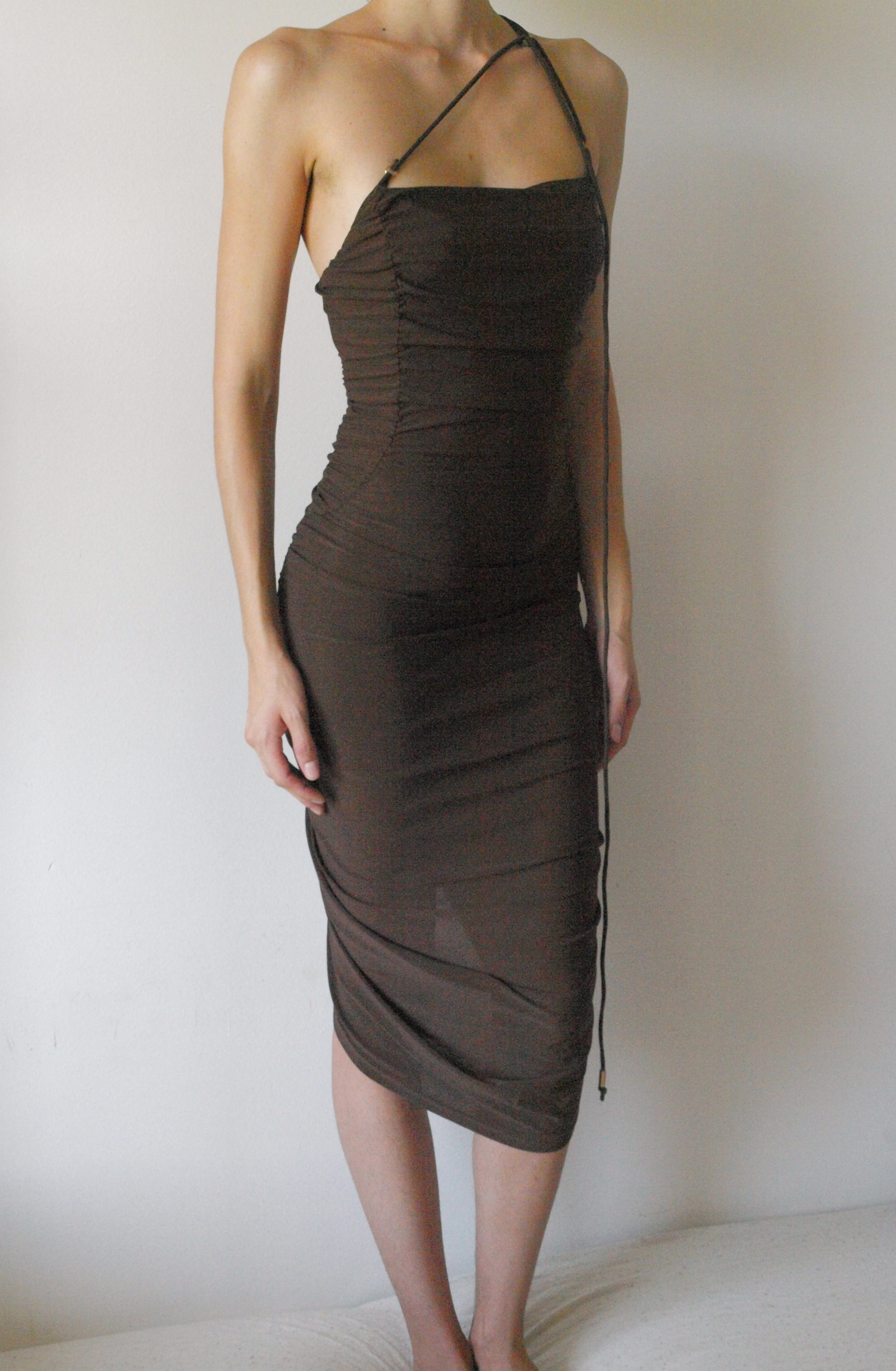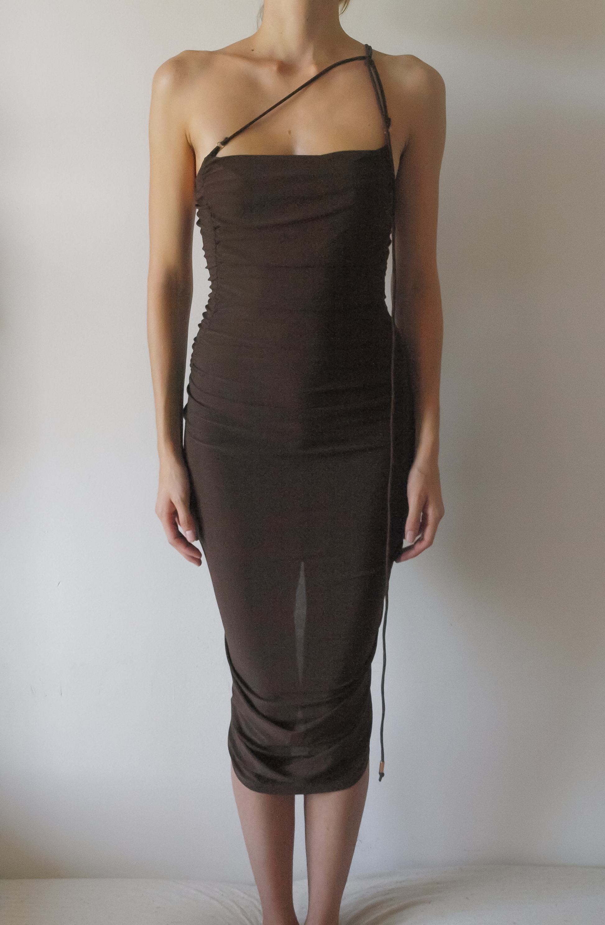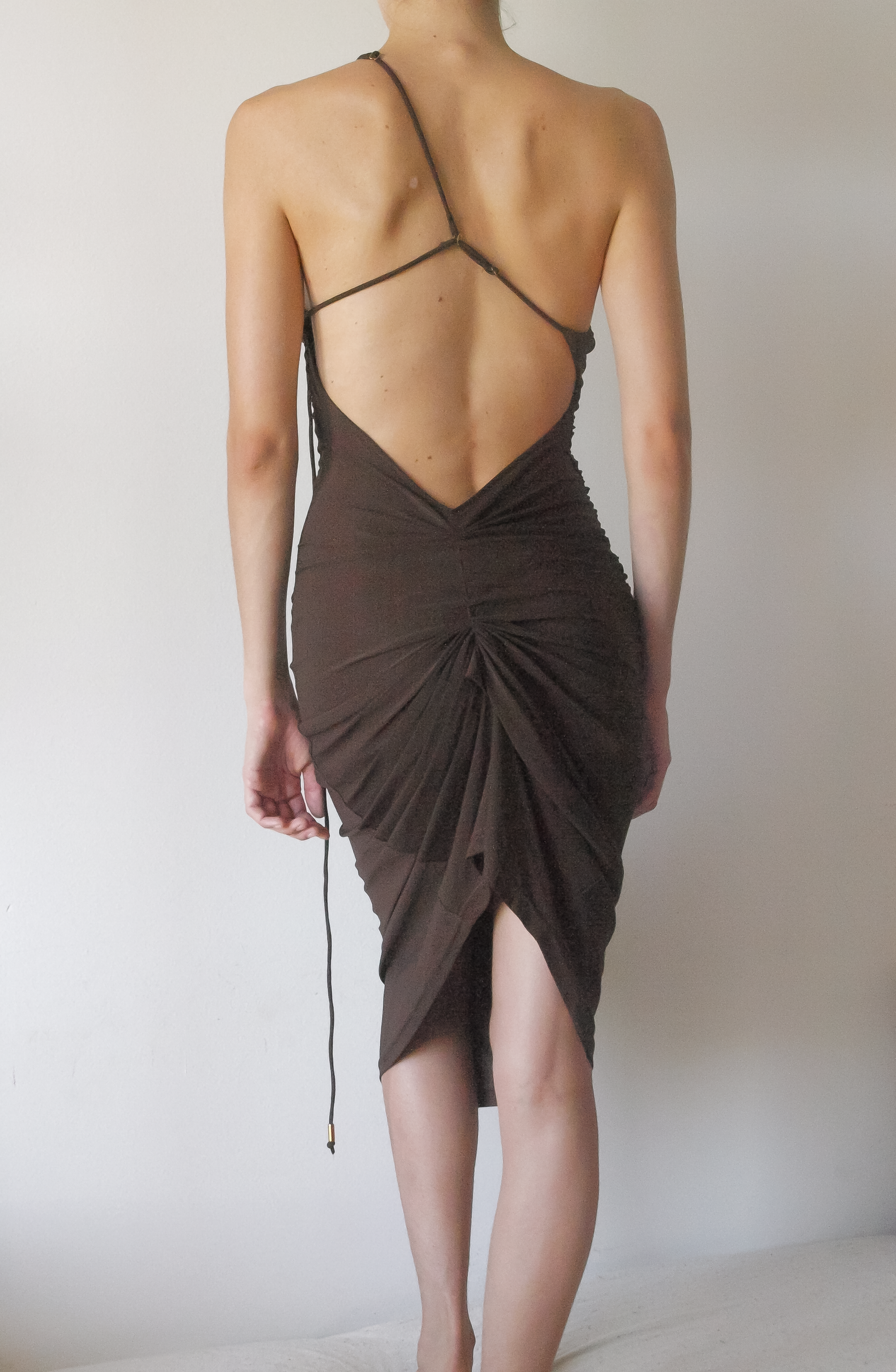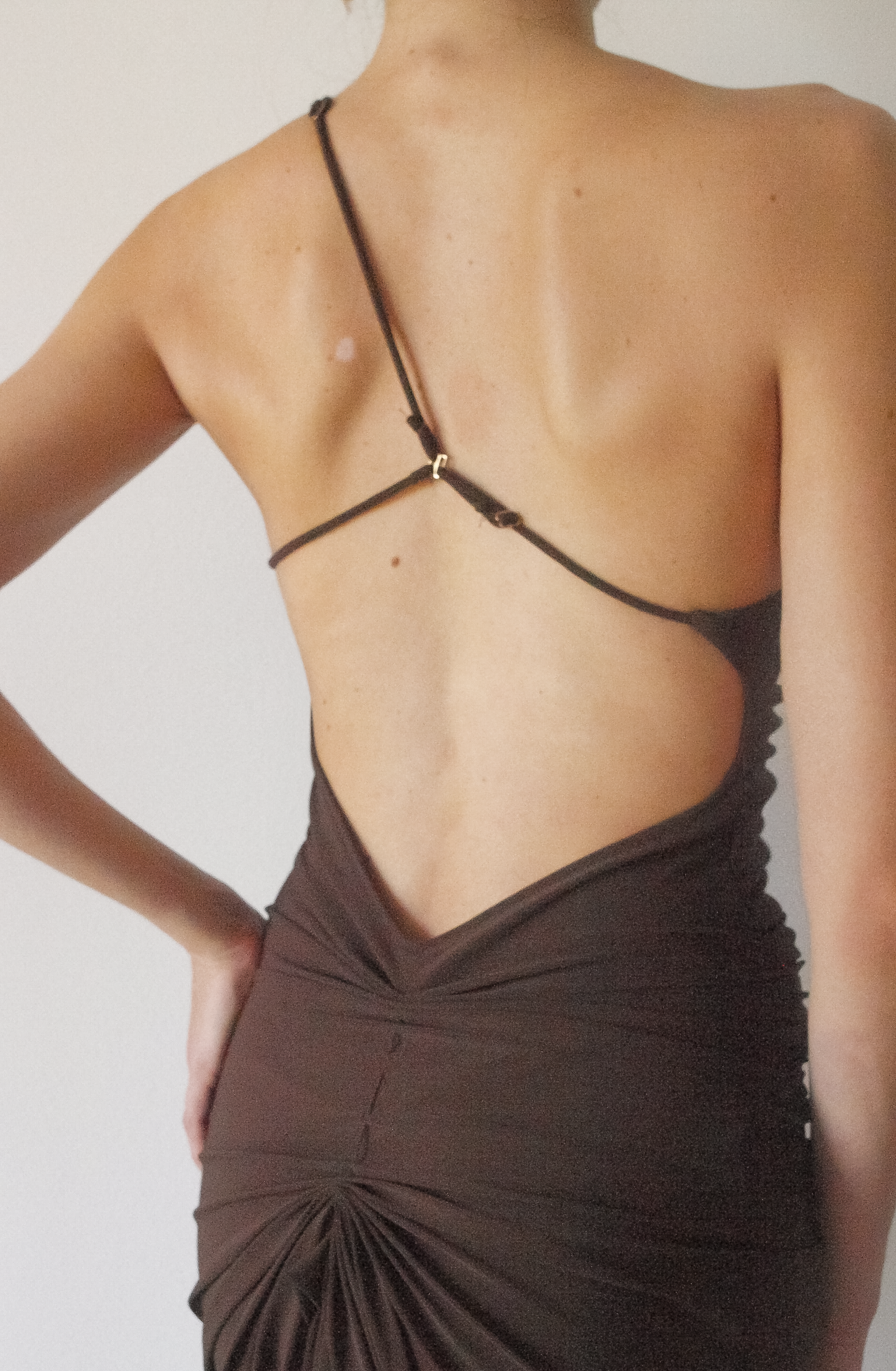Midi haljina u tamno smeđoj nijansi izrađena od laganog materijala koji prati liniju tijela. Asimetrična naramenica prelazi preko ramena i stvara zanimljiv kontrast otvorenim leđima. Drapiranje na stražnjoj strani dodaje dinamiku kroju, dok uski rez naglašava siluetu. Elegantna i zavodljiva, ova haljina ističe se minimalističkim detaljima i modernom konstrukcijom.