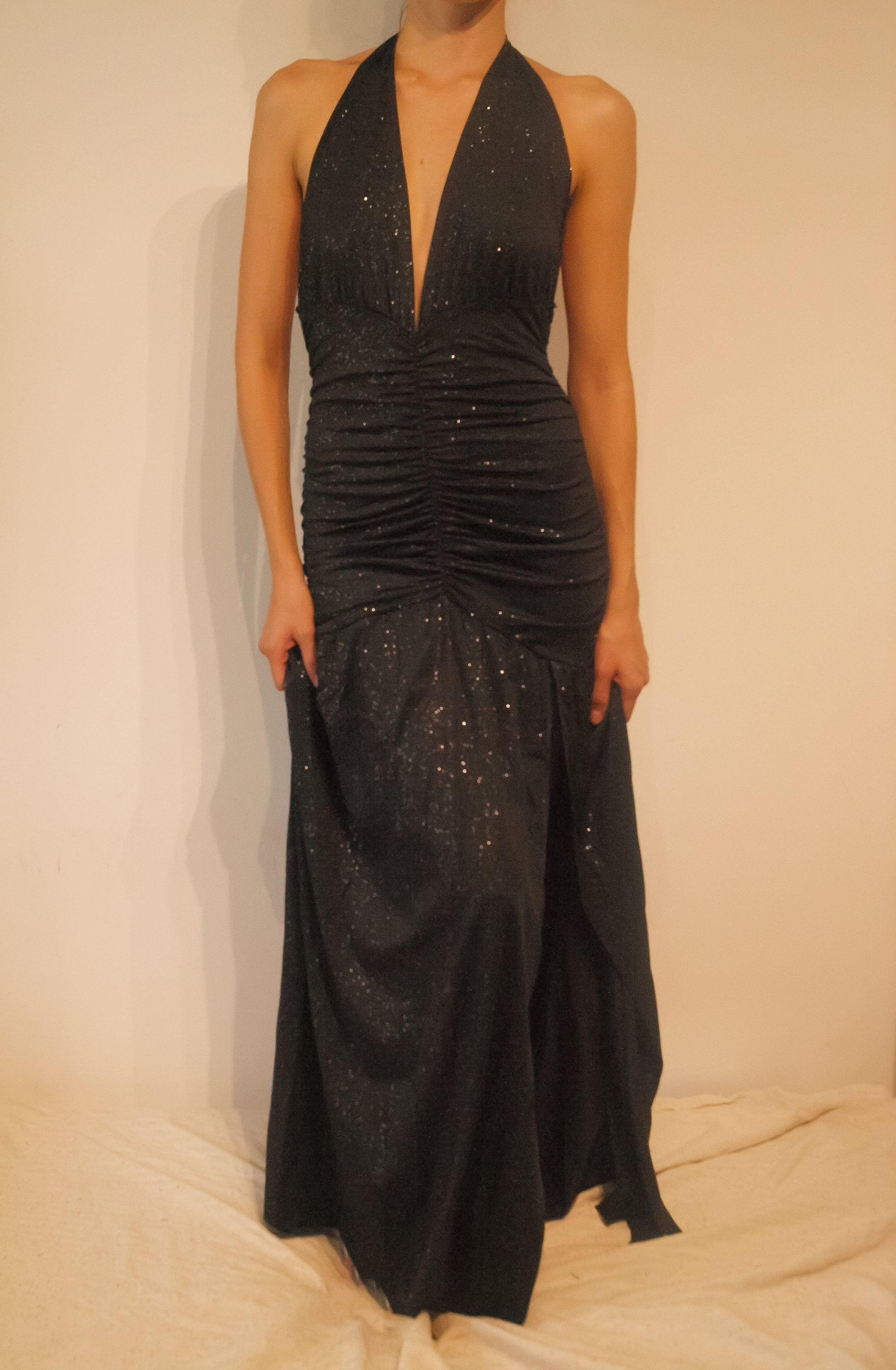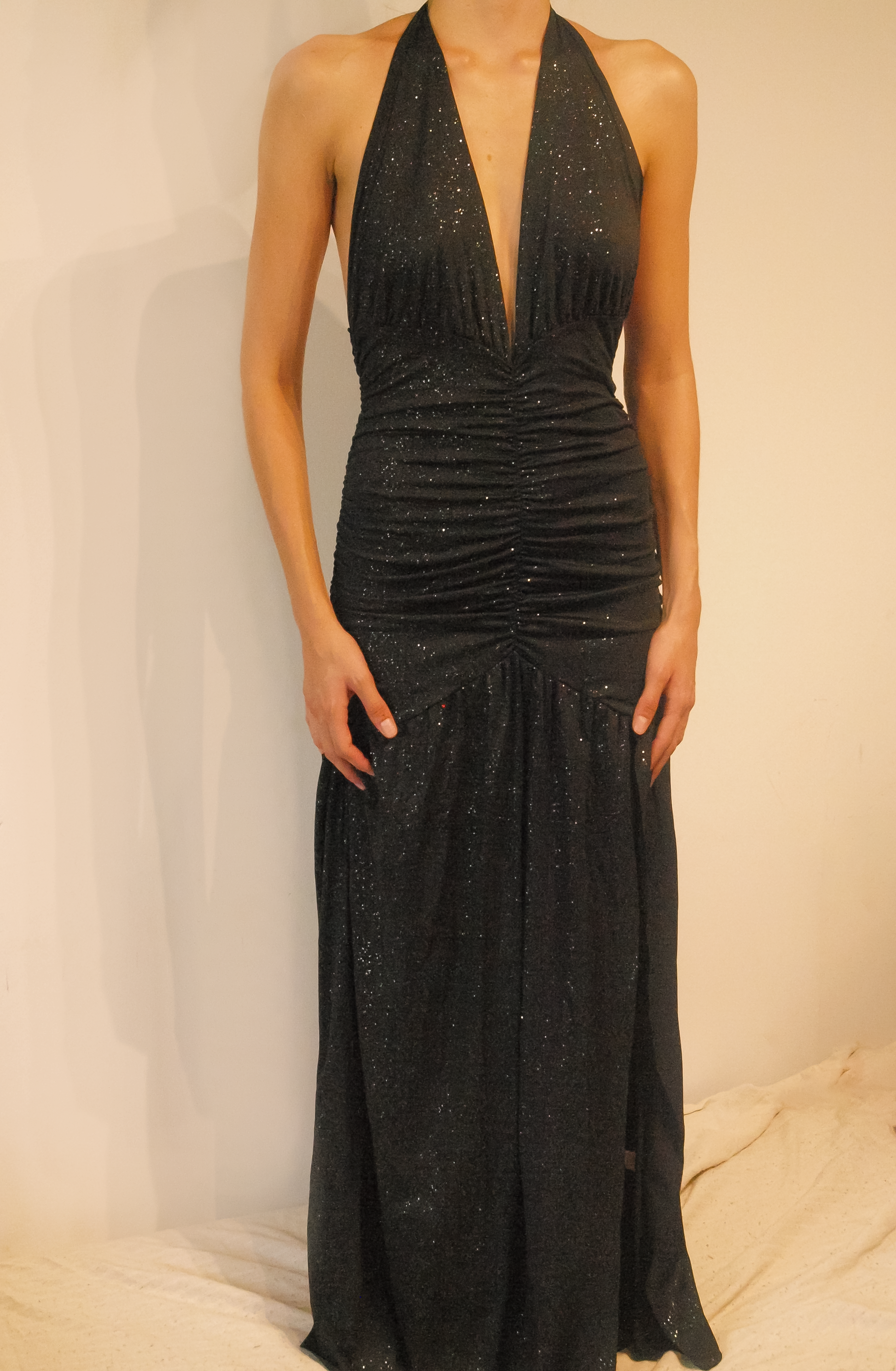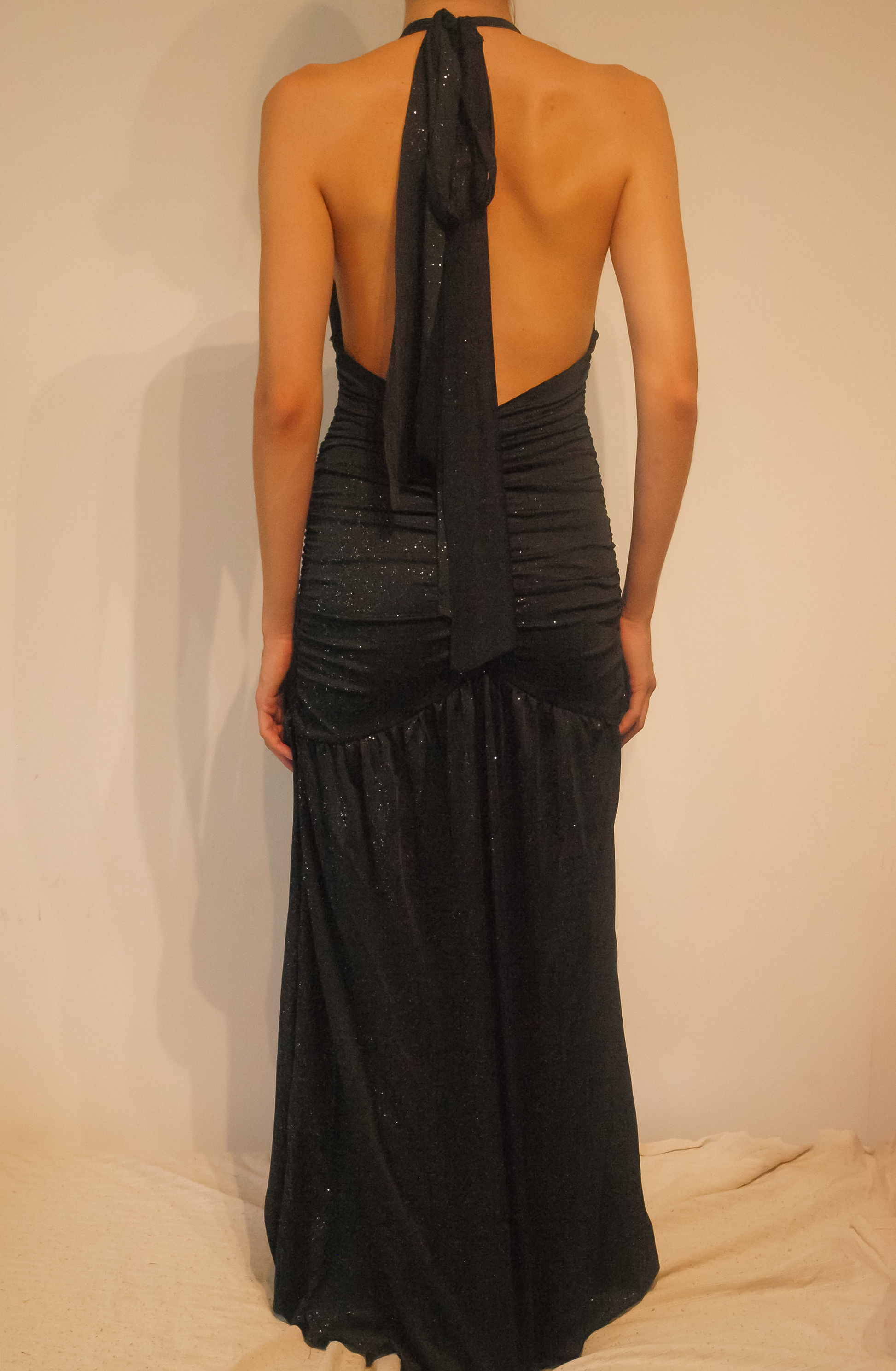 Noir Mirage zamišljena je za večeri kada je dovoljna samo jedna silueta da privuče pažnju. Duboki izrez na prednjoj strani naglašava dekolte, dok nabori u središtu stvaraju dinamiku i oblik tijela. Donji dio pada u mekane panele s prorezom. Stražnja strana ostaje otvorena, s trakama koje se vežu oko vrata i ostavljaju prostor leđima da budu u fokusu. To je haljina koja spaja dramatičnost crnog platna i suptilni odsjaj svjetlosti.