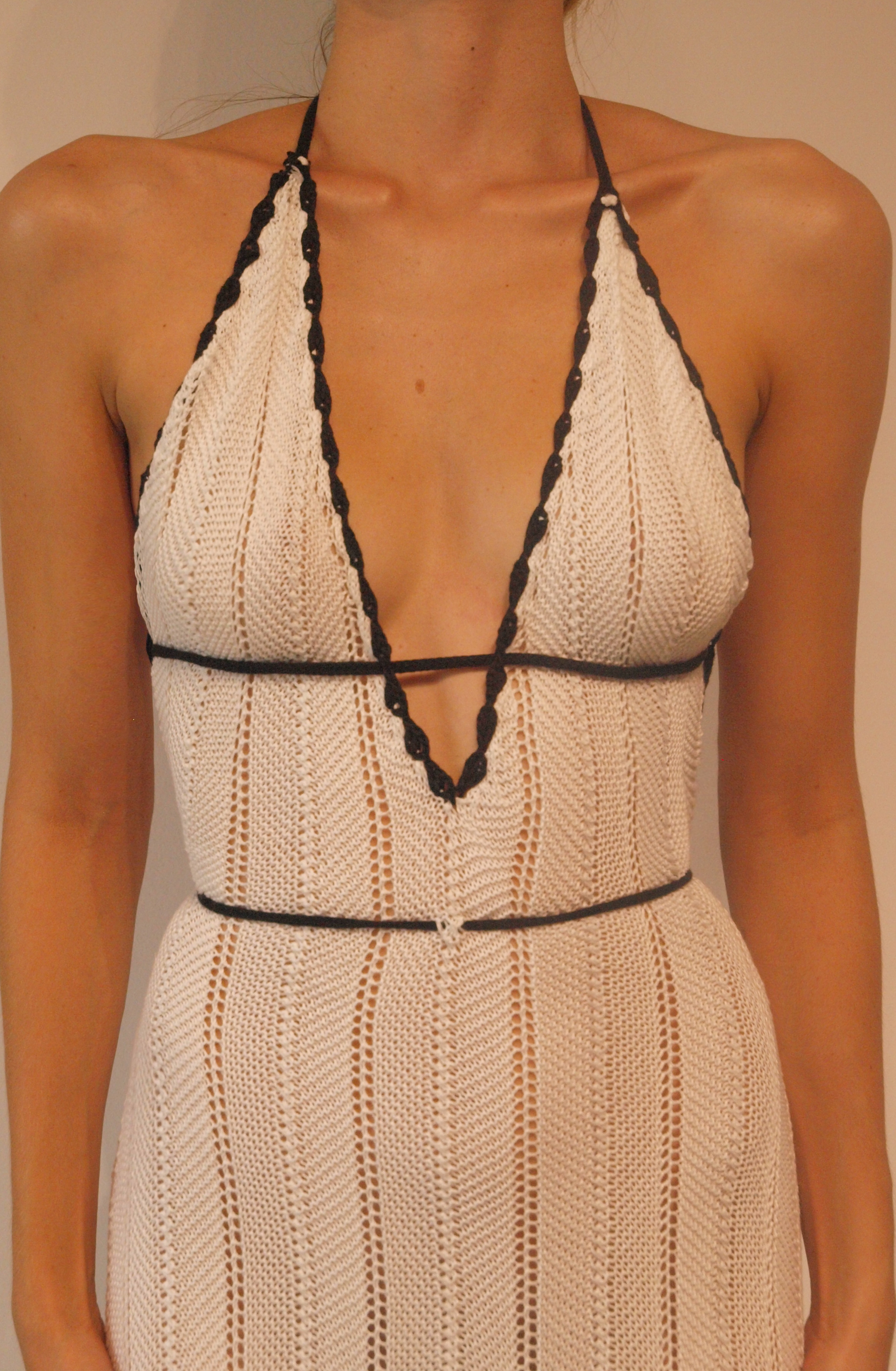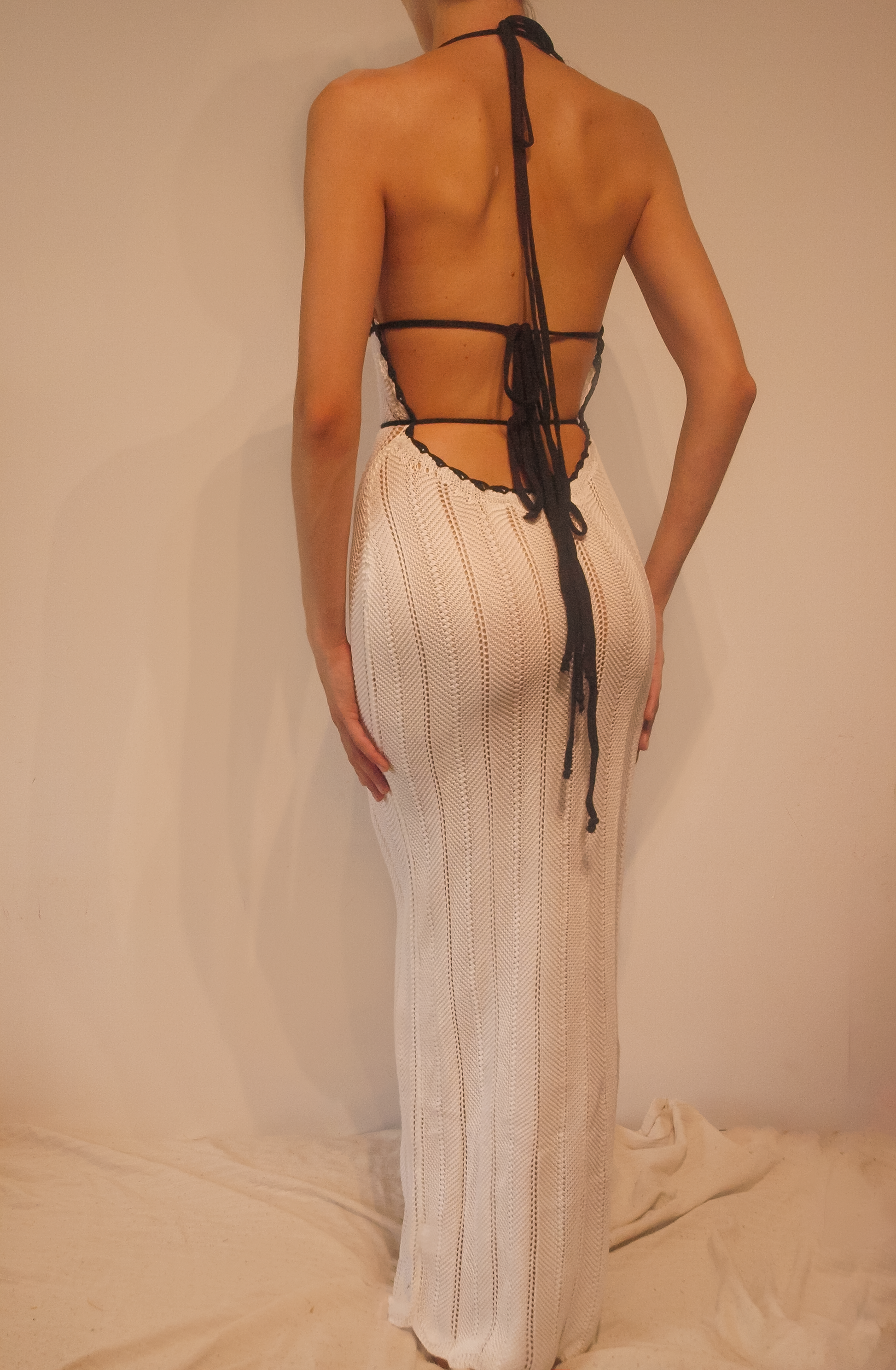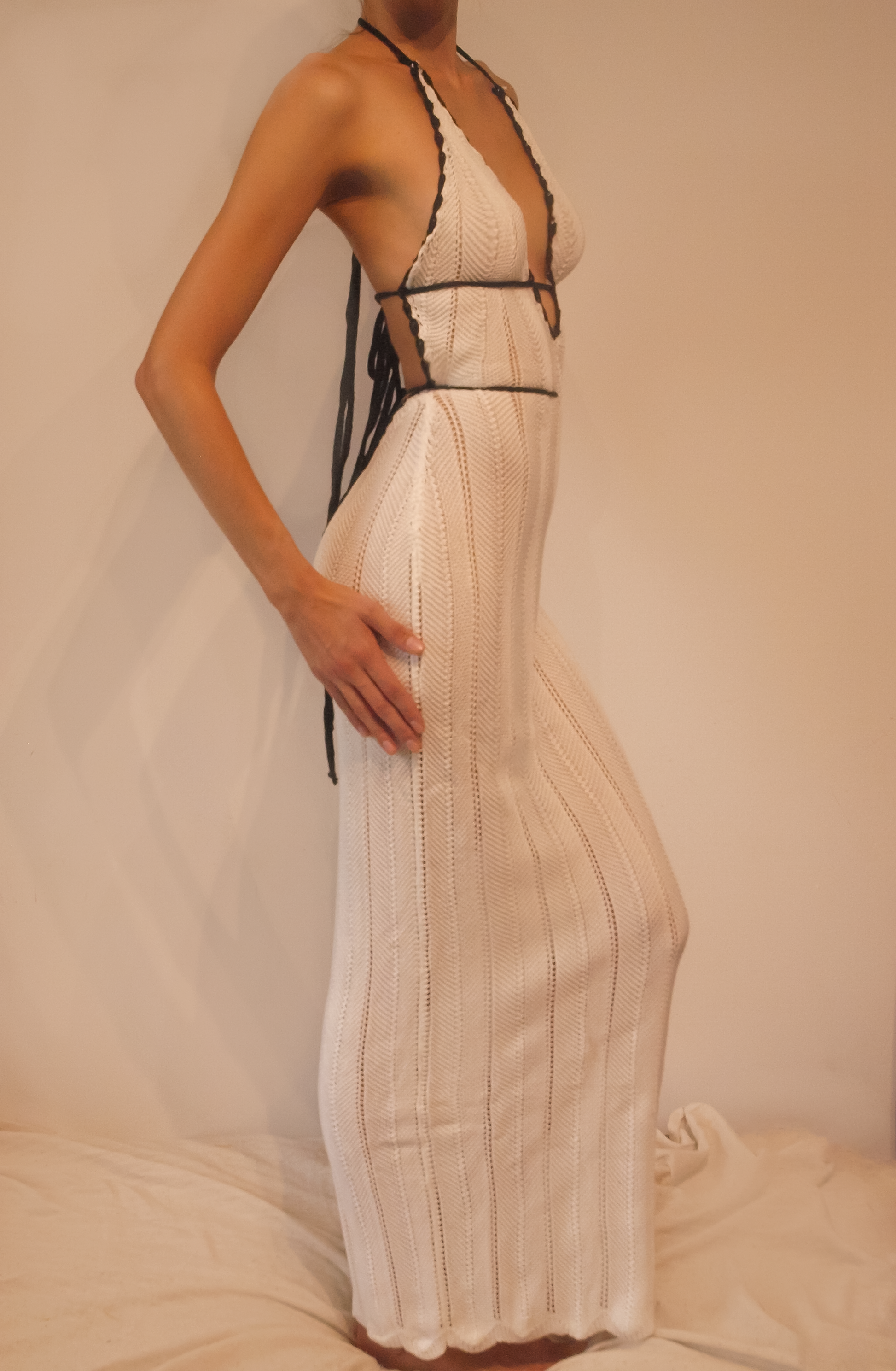 Riva Blanc donosi spoj jednostavnosti i modernog dizajna. Riječ je o dugom, uskom kroju koji naglašava prirodnu liniju tijela, dok vertikalni uzorak vizualno izdužuje siluetu. Duboki V-izrez sprijeda krasi tanki crni obrub. Leđa su potpuno otvorena, s vezicama koje omogućuju prilagodbu i udobno nošenje.
