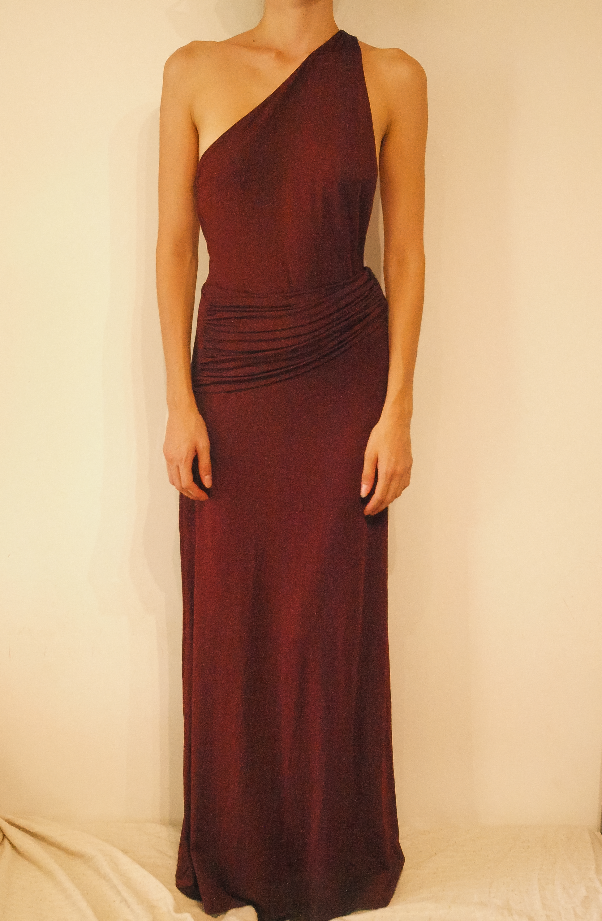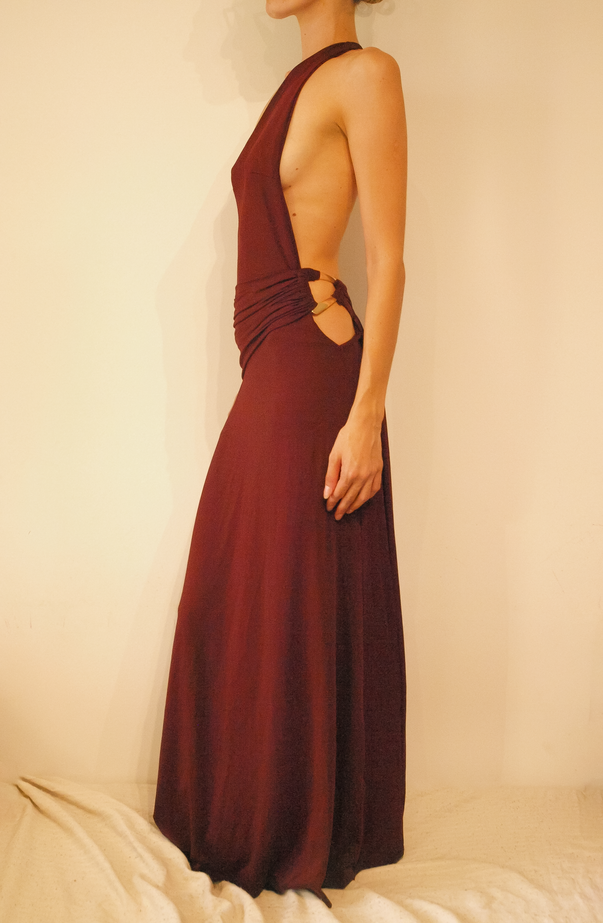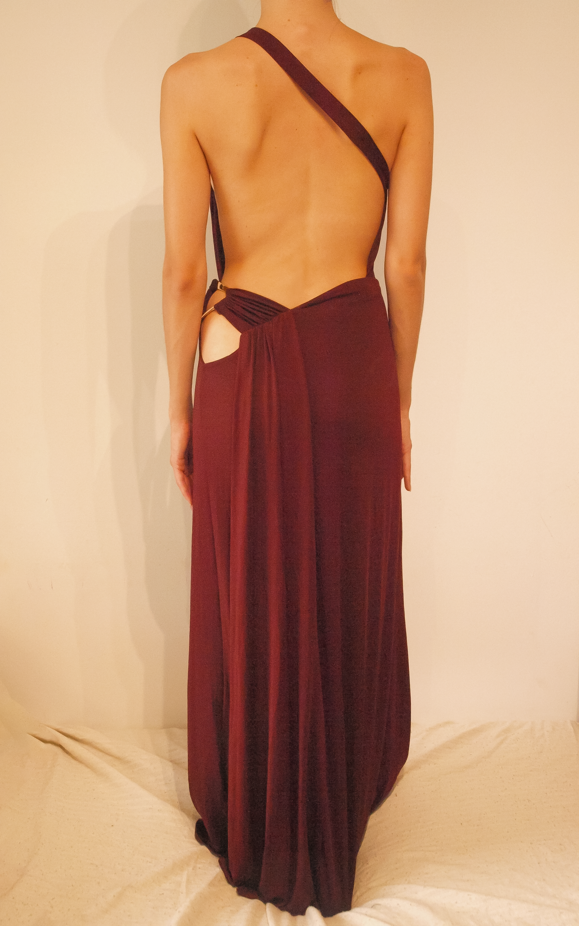 Haljina Zavodljivi Sumrak osmišljena je za žene koje žele ostaviti snažan dojam. Duboka bordo nijansa podsjeća na luksuz, dok asimetričan kroj s otvorenim leđima i bočnim izrezima stvara savršenu ravnotežu između elegancije i senzualnosti.
